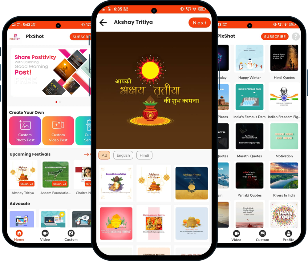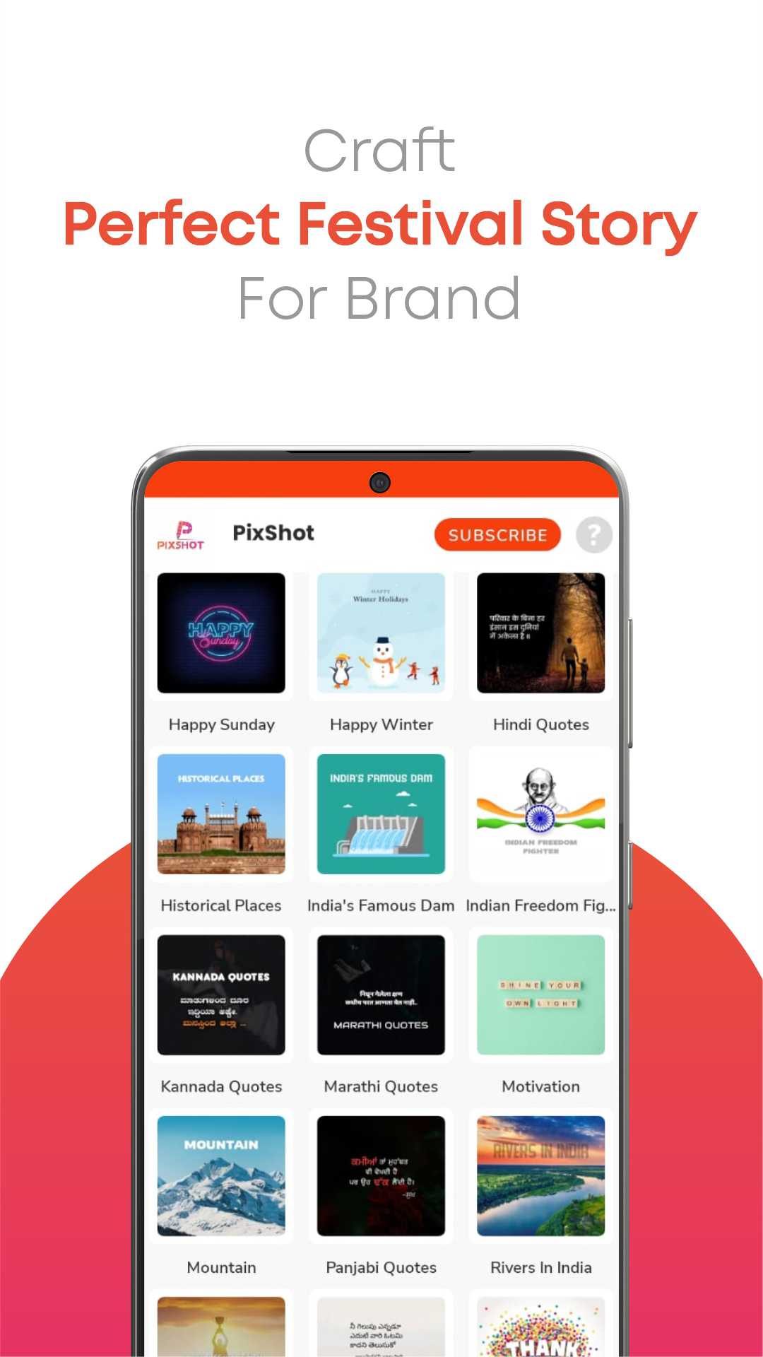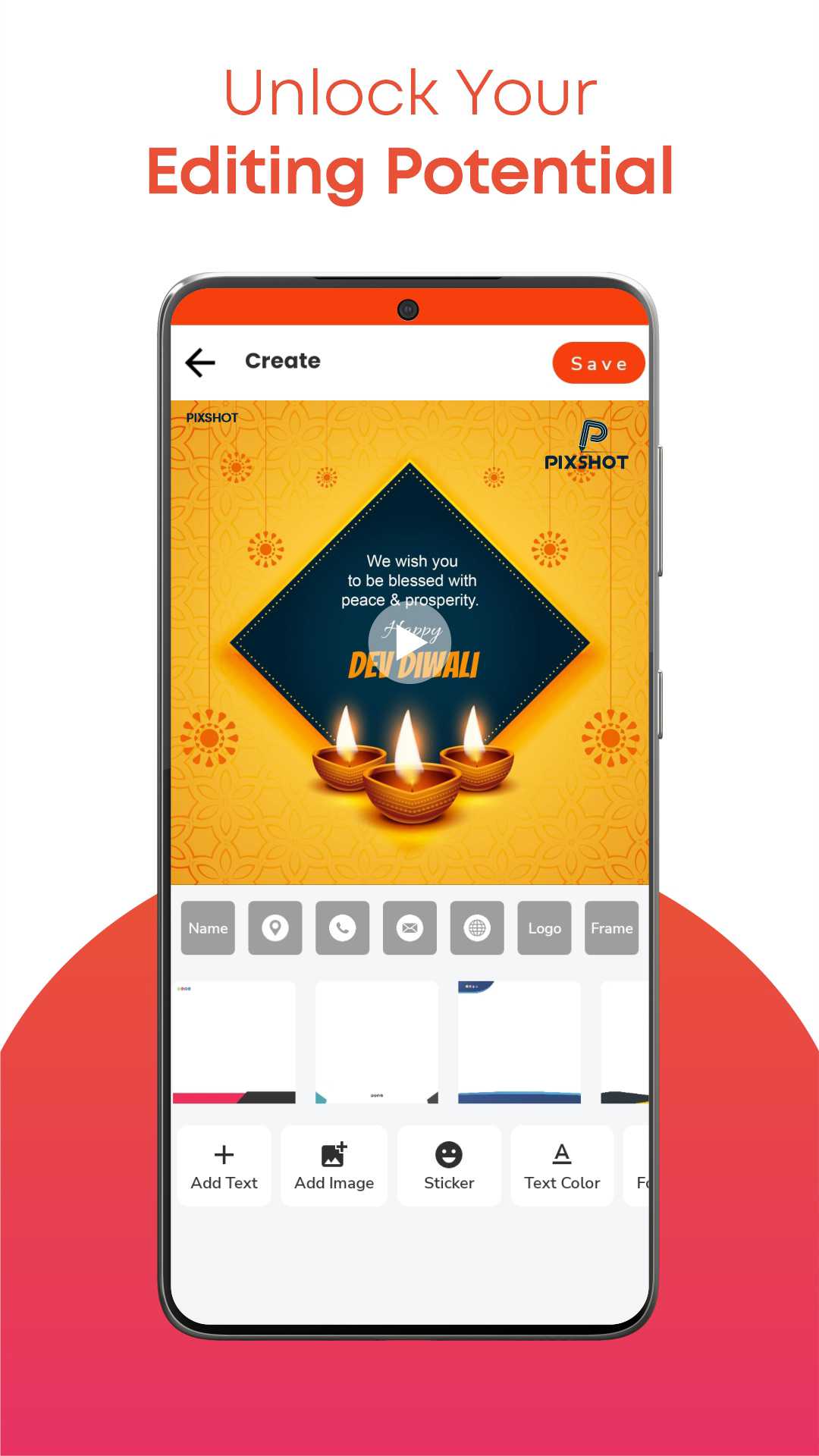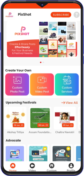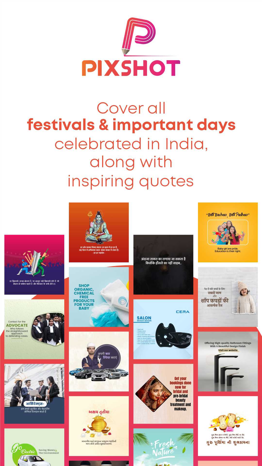 PixShot Festival Post Maker app helps create high-quality digital marketing content like daily posts, ad banners, festival designs, and more. It offers design templates such as festival images, greeting cards, and custom photo frames. With PixShot, elevate your online presence and promote your services or run political campaigns.
