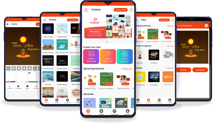 Posters and videos for various events in the year: Mahavir Jayanti, Passover Day, Hanuman Jayanti, World Health Day, Good Friday, Easter, Baisakhi Post, Ambedkar Jayanti, Tamil New Year, Bihu, Vishu, Bengali New Year, Ekadashi Post, Eid al-Fitr Post, Parashurama Jayanti, Akshaya Tritiya, Eid-E-Milad, Diwali, Bhai Dooj, Merry Christmas, Gandhi Jayanti, Dusshera, Jagannath Rathyatra, Bakri-id, Guru Purnima, Raksha Bandhan, Independence day, Janmashtami, Ganesh Chaturthi, Dhuleti Post, Holi Post, Ram Navmi Post. and more.