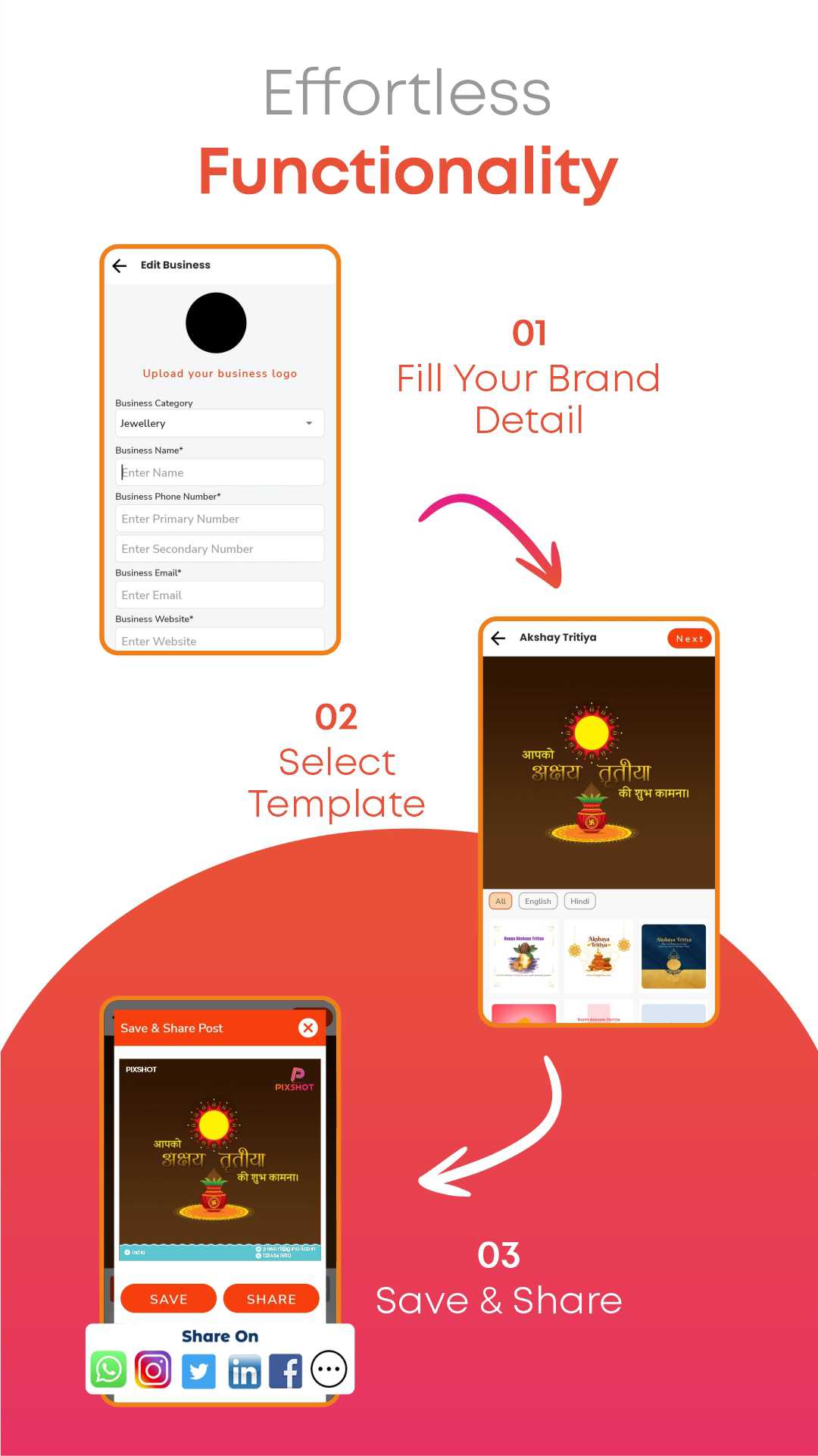 Save or share your professionally crafted post on popular social media networks including Facebook, Instagram, Twitter, What’s App. With just a few clicks.