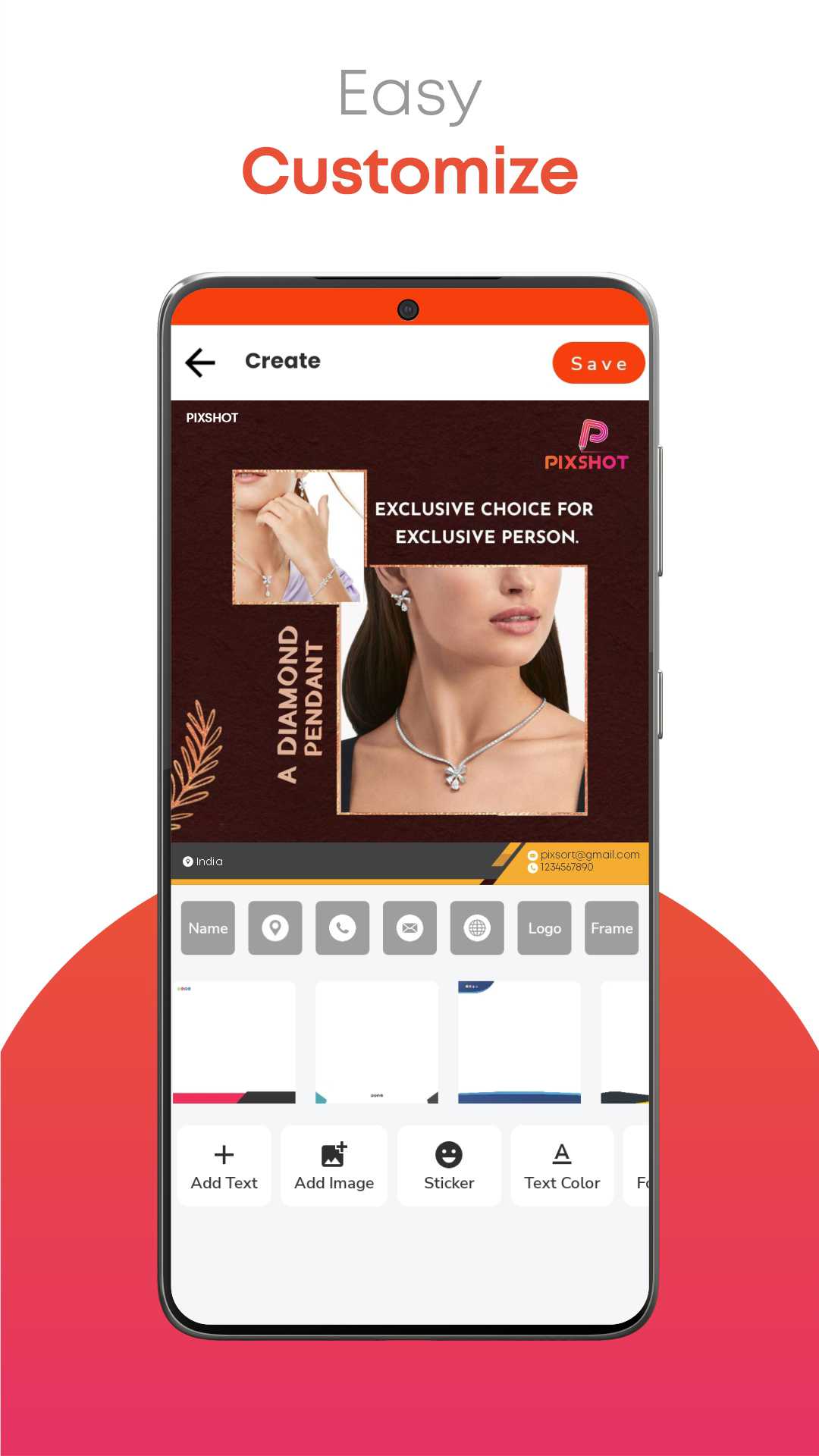 Easily personalize your business frame layout by adding a photo from your phone gallery and including important company details such as your logo, business name, mobile number, Gmail ID, website and address.
